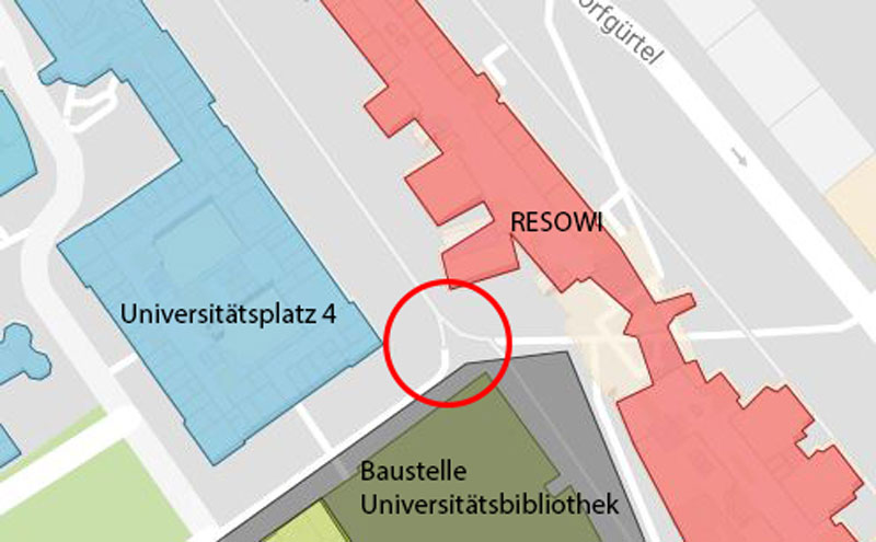 FußgängerInnen und RadfahrerInnen können großräumig über die Heinrichstraße und Schubertstraße ausweichen. Die Zu- und Abfahrt auf den Campus über die Heinrichstraße ist von der Sperre nicht betroffen. Der barrierefreie Zugang zum RESOWI ist über die Rampe am Geidorfgürtel möglich.