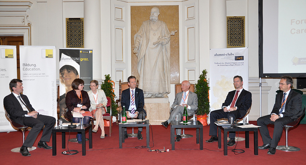 Danach diskutierte eine Podiumsrunde, bestehend aus Mag. Elmar Pichl, Dr. Peter Riedler, Univ.-Prof. Dipl.-Ing. Dr. Horst Bischof, Lori Manders (University College London) und Mag. Dominik Kimmel (RGZM, Stv. Vorsitzender alumni-clubs.net), zum Thema "Beziehungen fürs Leben. Alumniarbeit und Fundraising an Universitäten und Forschungseinrichtungen. Wohin gehen wir?"