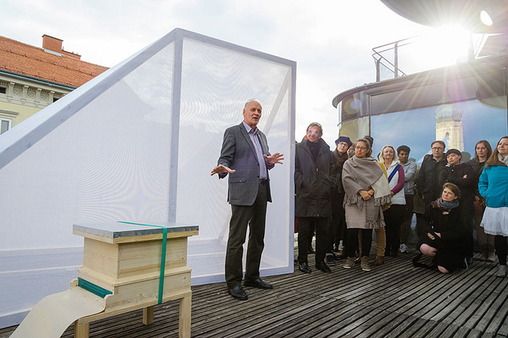 Vergangene Woche wurde auf der Dachterrasse des Grazer Kunsthauses ein außergewöhnliches Kunstwerk präsentiert. Sarah Bildstein, Studentin an der Akademie der bildenden Künste Wien und Dissertantin der Kunstgeschichte an der Universität Graz, entwickelte eine Installation als Wind und Sonnenschutz für das Bienenvolk. Der Stock beherbergt eine Population von ca. 9.000 Bienen und kann im Laufe der Zeit von bis zu 35.000 Artgenossen bewohnt werden. Rund 8.000 dieser Tiere werden bis Ende Oktober die Murufer und den Schlossberg als neuen Lebensraum und Nahrungsquelle entdecken.
