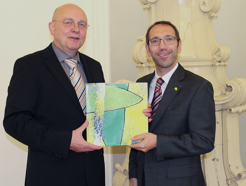 Gutachter Jürgen Koch überreichte im Auftrag der ArtSet Qualitätstestierung GmbH kürzlich an Mag. Dr. Martin H. Bauer, Geschäftsführer von UNI for LIFE, das Zertifikat und zwar in Form einer farbenfrohen Keramikfliese. Das Testat ist vier Jahre gültig.