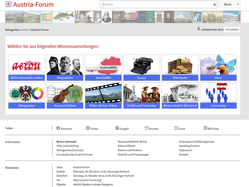 Mit dem Austria-Forum wächst derzeit im WWW ein einzigartiges Nachschlagewerk. Es ist eine umfassende digitale Sammlung von Austriaca, das sind multimediale Objekte, die Österreich im weitesten Sinn betreffen oder berühren. Bis zu 4000 BenutzerInnen pro Tag machen bereits von den Dokumenten Gebrauch. Zurzeit enthält das Austria-Forum fast eine halbe Million Objekte, davon mehr als 200.000 Bilder.