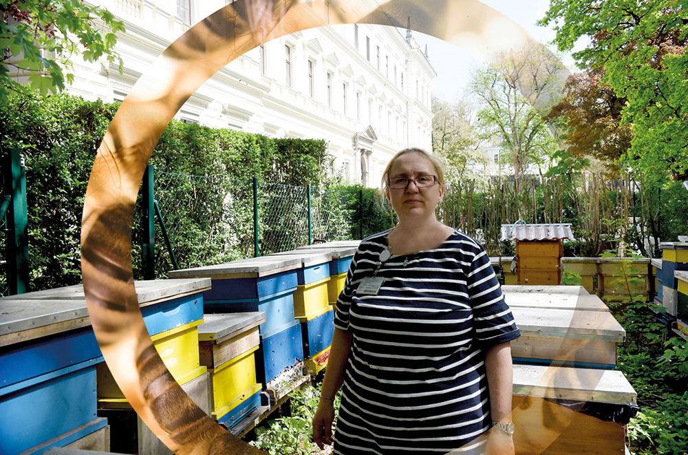 Es summt und schwirrt an der Ecke des Gebäudes Universitätsplatz 2. Hochbetrieb in eineinhalb Metern Höhe. „Wir haben Glück“, sagt Jutta Vollmann und schaut zum Himmel. „Denn wenn Schlechtwetter aufzieht, sind die Bienen angriffslustiger, auch Parfumstoffe in Shampoos und Duschbädern mögen sie nicht.“ Die Biologin kennt die Insekten vom Flügel bis zum Fühler. Jutta Vollmann ist für die Haltung der Honigbienen an der Universität Graz verantwortlich. Sie erzählt:
