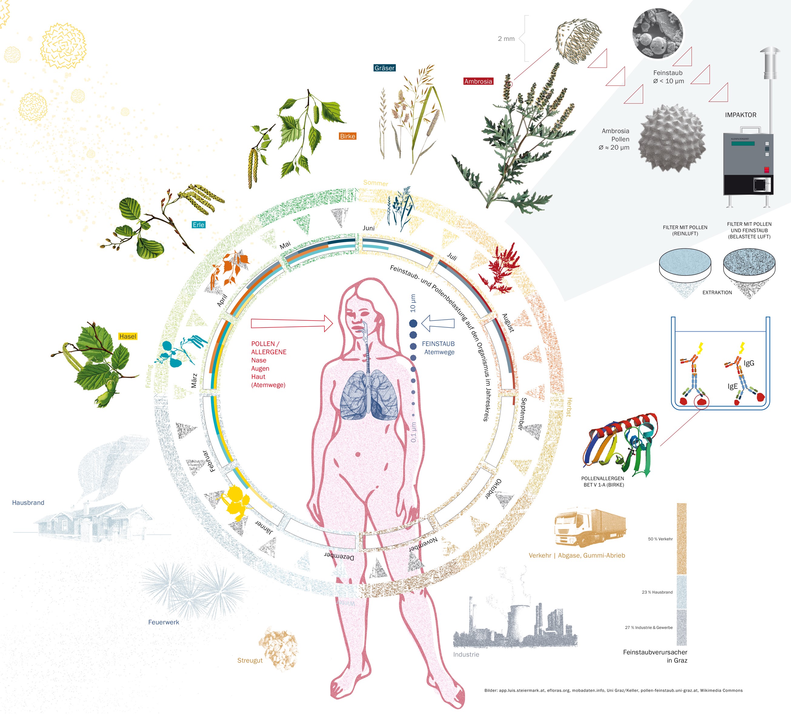 Jetzt im Frühling übergibt der Feinstaub den Pollen das reizende Kommando in der Luft. Inwiefern die menschengemachte Verschmutzung die Effekte des Blütenstaubs sowie anderer Allergenquellen beeinflusst, untersuchte bereits vor drei Jahren ein Team der Karl-Franzens-Universität gemeinsam mit Grazer SchülerInnen im Rahmen des vom Wissenschaftsministerium geförderten Sparkling-Science-Projektes „Pollenallergien und (Fein)staub 2“. „Mehrere Arbeiten weisen darauf hin, dass die steigende Umweltbelastung Menschen für Allergien empfindlicher macht“, erklärte Projektleiter Ao.Univ.-Prof. Dr. Walter Keller vom Institut für Molekulare Biowissenschaften. In den vergangenen zwei Jahren hat er gemeinsam mit dem Chemiker Ao.Univ.-Prof. Dr. Walter Gössler und der Botanikerin Dr. Ursula Brosch sowie SchülerInnen des BRG Kepler und der ECOLE HBLW Güssing das jahreszeitliche Pollenaufkommen dokumentiert, kontaminierten Blütenstaub chemisch analysiert sowie belastete und unbelastete Pollen immunologisch untersucht. Erste Experimente brachten ein unerwartetes Ergebnis: Die Allergene von künstlich mit Feinstaub kontaminierten Pollen weist überraschenderweise eine geringere Bindung von spezifischen Antikörpern (IgE) auf als jene von sauberen Pollen. Diese Bindung ist die Voraussetzung für eine allergische Reaktion. In der Fortsetzung des Projekts wollen WissenschafterInnen und SchülerInnen nun herausfinden, ob die „echte“ Luftverschmutzung ebenfalls die Reizwirkung der Pollen verändert und ob die bislang noch nicht analysierten Bestandteile des mit Feinstaub belasteten Blütenstaubs Allergien beeinflussen.