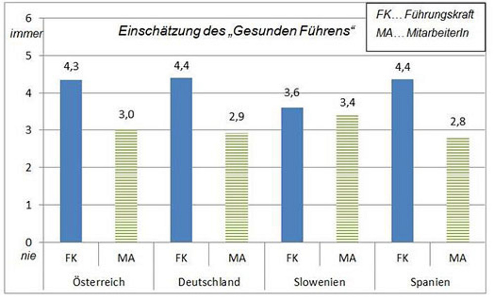 Abschließend wurde analysiert, ob sich die Selbstsicht der ChefInnen hinsichtlich „Gesunder Führung“ von jener ihrer MitarbeiterInnen unterscheidet. „Interessant ist, dass österreichische, deutsche und spanische Vorgesetzte ihr eigenes Führungsverhalten viel positiver bewerteten als slowenische, die sehr viel kritischer waren. Dafür schätzen die slowenischen MitarbeiterInnen im Vergleich zu jenen der anderen Länder ihre direkte Führungskraft viel positiver ein.