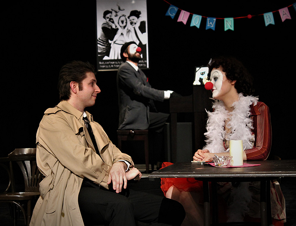 In einem spritzigen Cocktail aus Komödie, Liebesdrama und Action tauchen BesucherInnen in die ominöse Clown Bar ein, die Schauplatz einer Reise in die Vergangenheit wird. Warum singt Dusty (Pascal Vötsch) solch traurige Lieder? Hat der Clownboss Bobo (Janos Lasselsberger) Happy vergeben? Und um welchen der zwei wickelt Blinky (Rachel McDonald) schließlich ihre Federboa? Diese und noch viele andere Geheimnisse werden im Stück gelüftet. In seinem Stück verwebt Szymkowicz geschickt grimmigen Noir-Alltag mit humorvoller Absurdität des Seins. Von Verrat und Mord über Freundschaft, alte Romanzen und die Beziehung zwischen zwei Brüdern, die unterschiedlicher nicht sein könnten.