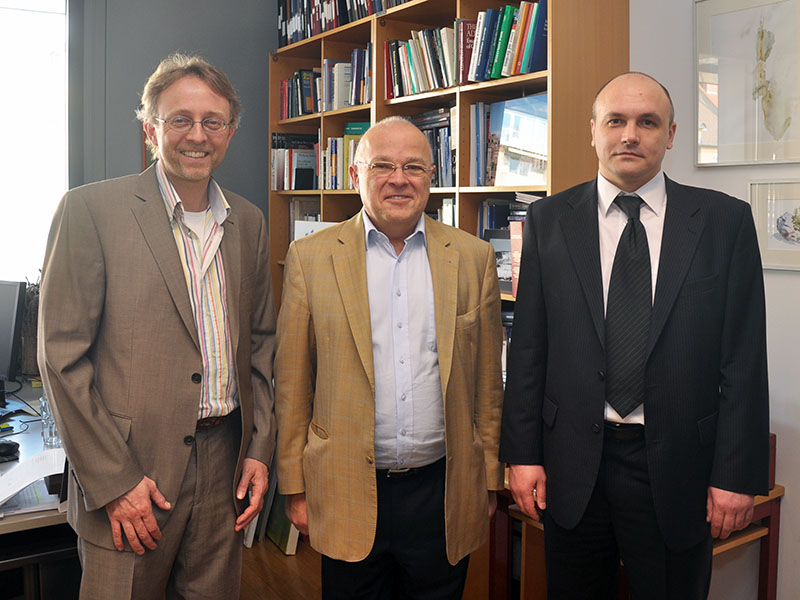 Während sich die Krise in der Ukraine zuspitzt und international ihre Kreise zieht, setzt die Karl-Franzens-Universität Graz weiter auf Dialog und fördert den wissenschaftlichen Austausch. Am 18. März 2014 begrüßten Dekan Univ.-Prof. Dr. Joseph Marko und Univ.-Prof. Dr. Thomas Krüßmann, Leiter des Russian East European & Eurasian Studies Centre, an der Rechtswissenschaftlichen Fakultät Prof. Dr. Sergey Nezhurbida, Professor für Strafrecht und Kriminalistik an der ukrainischen Universität Chernivtsi (Czernowitz).