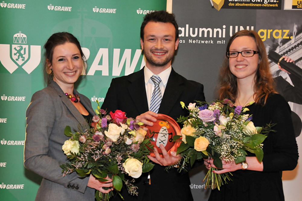 Traditionell ehrt die Rechtswissenschaftliche Fakultät gegen Ende des Jahres ihre drei besten AbsolventInnen sowie die VerfasserInnen herausragender Diplomarbeiten und Dissertation. In einem feierlichen Rahmen an der Uni Graz wurden diesmal am Freitag, den 20. Dezember, die Auszeichnungen und Urkunden vergeben und die besten REWI-AbsolventInnen des Studienjahres 2012/13 gekürt: Mag. Matthias Pendl, Mag. (FH) Mag. Angelika Gerstmann sowie Mag. Anna Angela Zingl, BA sind die Top 3. Nebst der Auszeichnung werden sie auf der Ehrentafel im Resowi-Gebäude verewigt.