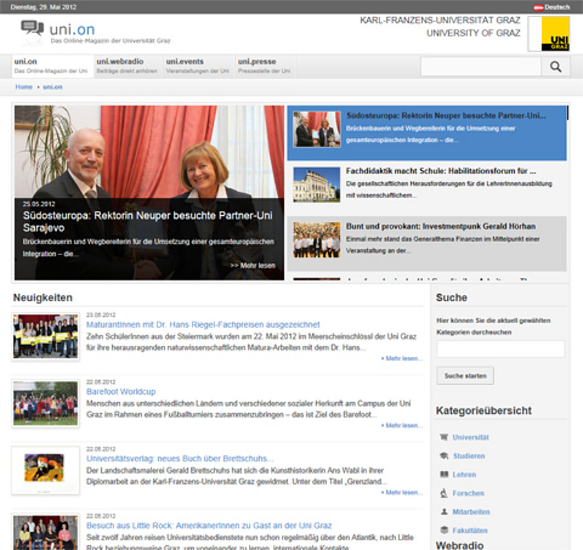 Benutzerfreundlich, modern und schlank präsentiert sich der Webauftritt der Karl-Franzens-Universität Graz, der nach einer kompletten Überarbeitung am 31. Mai 2012 neu strukturiert online ging.