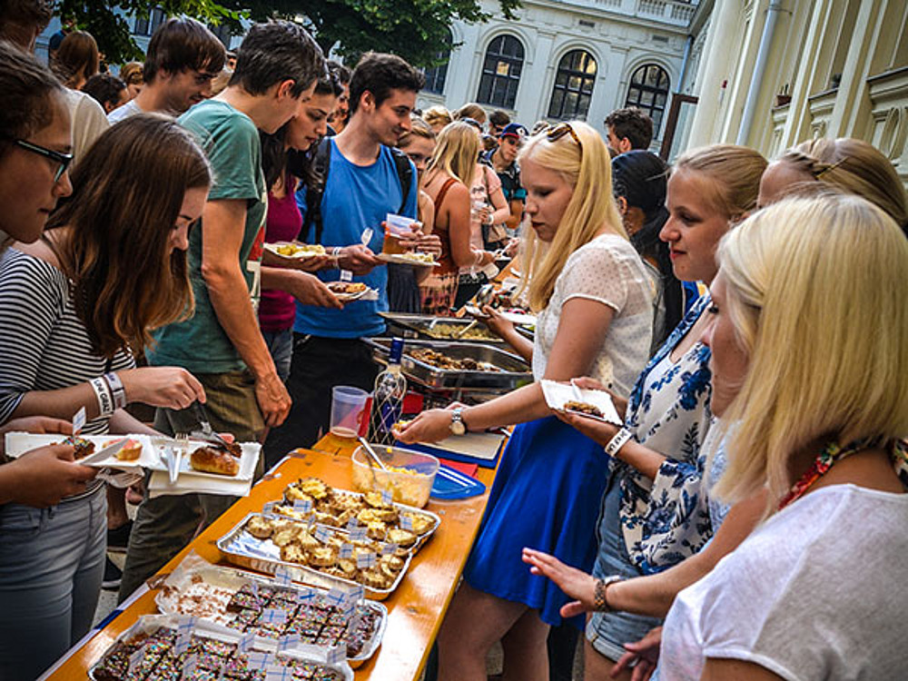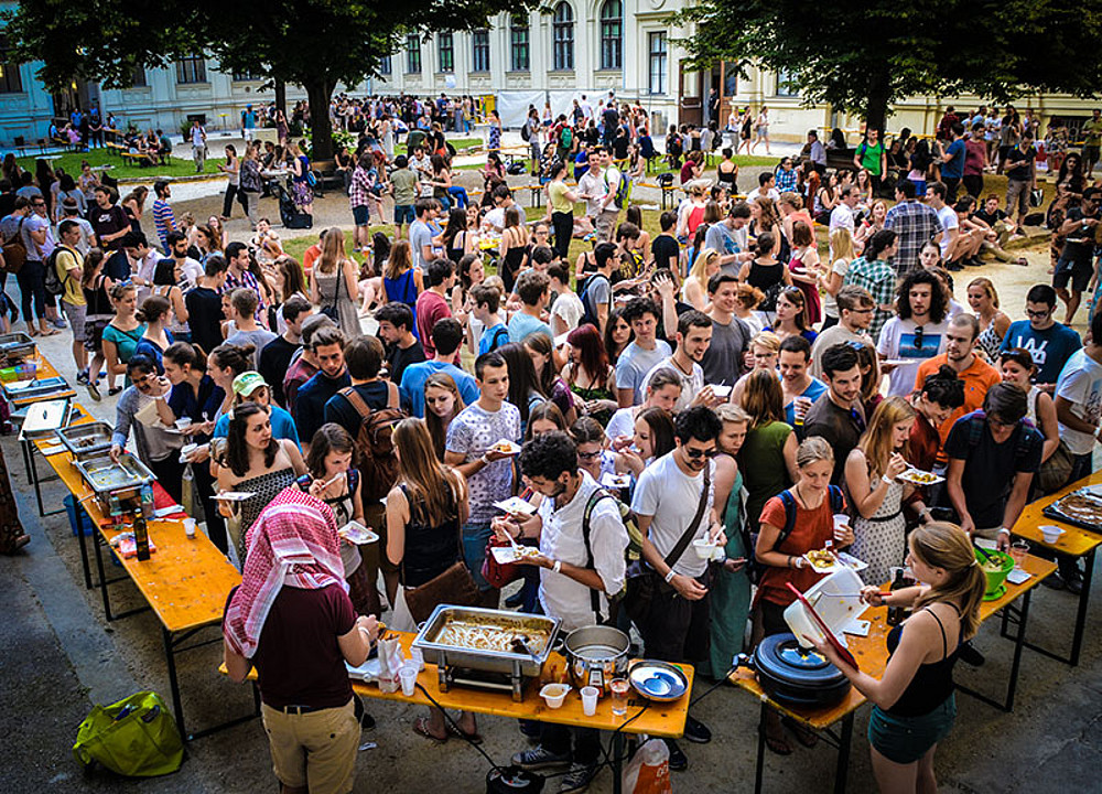 Getränke und exotisches Essen aus aller Welt lockten rund 600 BesucherInnen in den Innenhof des Hauptgebäudes der Uni Graz: Vertreten waren vier Kontinente mit 25 Ständen; unter anderem gab es traditionelle Gerichte aus Aserbaidschan, der Dominikanischen Republik, Moldawien oder dem Iran. Zudem gab es zusätzlich ein "Dumpster Buffet" einer Food-Sharing-Gruppe, das mit übrig gebliebenen Lebensmittel von Supermärkten zubereitet wurde. Für die musikalische Untermalung sorgte die Band "Plenty for Twenty", die mit funkigen Groves die Menge zum Tanzen anheizte. Heiße Beats von DJ Attila sorgten für einen würdigen Abschluss eines mehr als erfolgreichen Events, bei dem auch begeistert multikulturell genetzwerkt wurde.