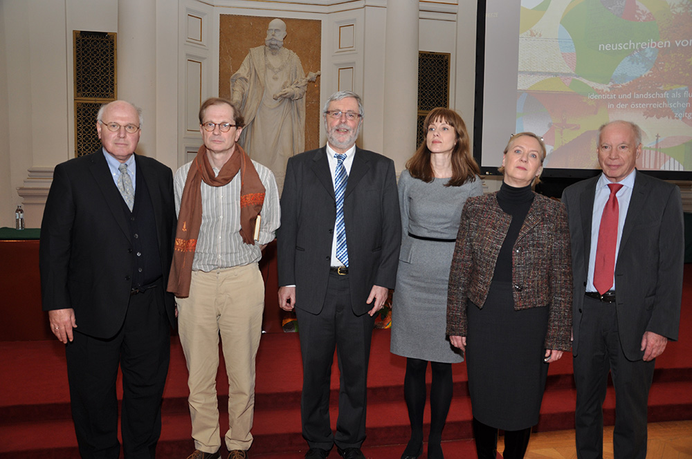 Hoch karätig besetztes Symposium: Laudator Jay Winter, Schriftsteller Josef Winkler, Helmut Konrad, Literaturwissenschafterin Joanna Drynda, Schauspielchefdramaturgin Regina Guhl und Linzer Kunstuni-Rektor Reinhard Kannonier (v. l.)