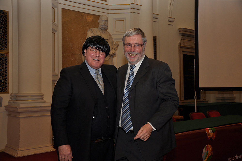 Die pointierte Laudatio hielt Jay Winter, Professor an der Yale University/USA. Im ersten Teil seiner Rede hob Winter, auch Ehrendoktor der Geisteswissenschaftlichen Fakultät der Uni Graz, Konrads Leistungen für die Arbeitergeschichte und die beeindruckende Kommunikationsfähigkeit hervor: „Er hat nie von oben, sondern immer auf Augenhöhe mit Studierenden kommuniziert.“ Und der zweite Teil der Laudatio unter dem Titel „die haarige Geschichte des Helmut Konrad und die Generation von 1968“ sorgte für viele Lacher und begeisterten Applaus in der voll gefüllten Aula.