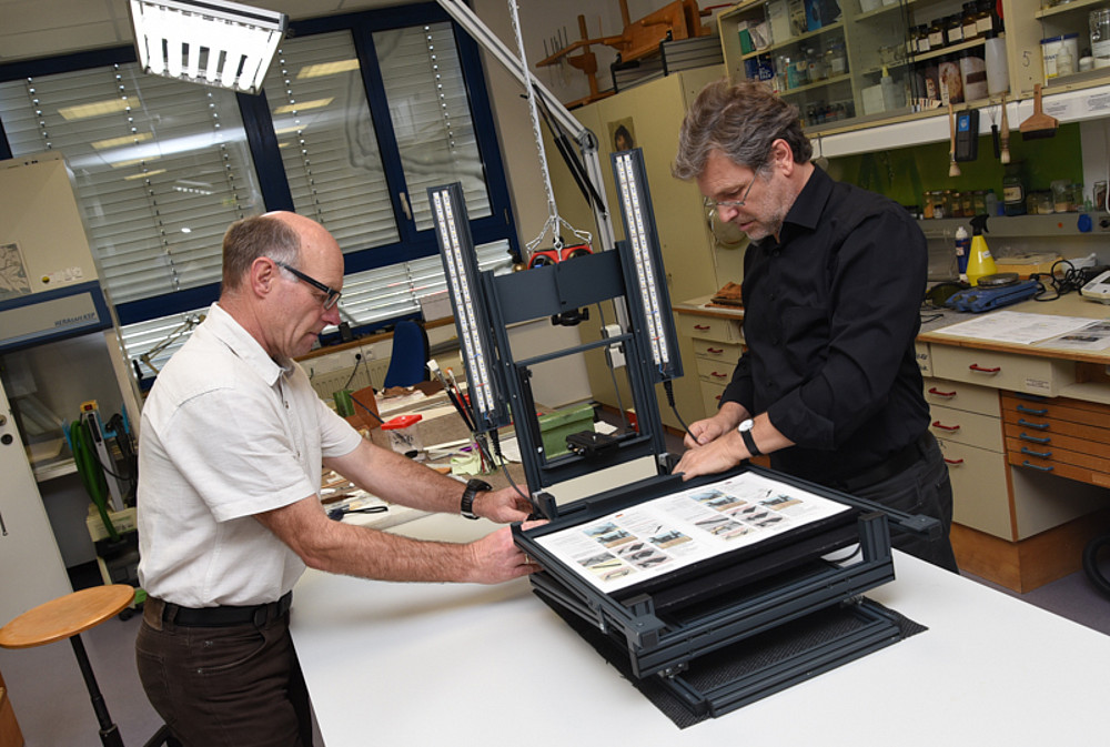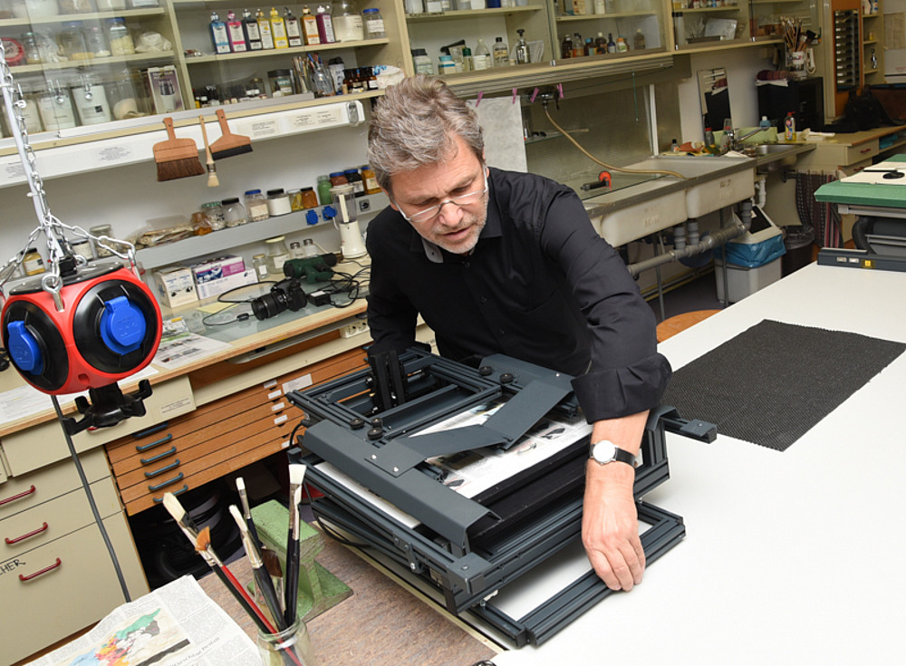 Der „Traveller’s Conservation Copy Stand – TCCS 4232“ ist eine Erfindung von Weltformat. Die mobile Version des Grazer Büchertisches, der eigens für die schonende Digitalisierung von alten Schriften an der Universitätsbibliothek Graz (UB) und am VESTIGIA-Zentrum für die Erforschung des Buch- und Schrifterbe entwickelt wurde, feiert heuer sein zehnjähriges Jubiläum. „Ursprünglich war der Traveller für den Feldeinsatz von Uni-Graz-WissenschafterInnen gedacht, die an Handschriften in Armenien und Bulgarien forschen“, erinnert sich Manfred Mayer. Der Restaurator, der sich an der UB unter anderem mit Digitalisierung beschäftigt, ist der Erfinder des praktischen Geräts, das in einen handelsüblichen Koffer passt und mittlerweile in die ganze Welt verkauft wird. Und genau das ist das Erfolgskonzept des einzigartigen Travellers: „Wir haben damals mit der Serienreife des Prototyps eine Marktlücke geschlossen“, führt Mayer aus. Der mobile Büchertisch ist nämlich in nur zehn Minuten an jedem beliebigen Ort – vor allem in schwer zugänglichen Klosterbibliotheken – einsatzbereit. Er ist so konzipiert, dass ihn eine Person aufbauen und bedienen kann. Kernstück des rund 7 200 Euro teuren Geräts ist eine ausgeklügelte Laseroptik (Fokal Point Assistent), die es erlaubt, mit einer konstanten Schärfe der Kameralinse zu fotografieren. Und das stets im richtigen Maßstab. LEDs sorgen für eine einwandfreie und energiesparende Ausleuchtung des Objekts; optional kann auch UV-Licht eingesetzt werden. Damit lassen sich die Struktur der Oberfläche oder sogar verborgene Texte besser erkennen. Der Traveller funktioniert mit jeder Digitalkamera. In der Bücherwiege finden Objekte mit einer maximalen Größe von 42 mal 32 Zentimeter Platz.