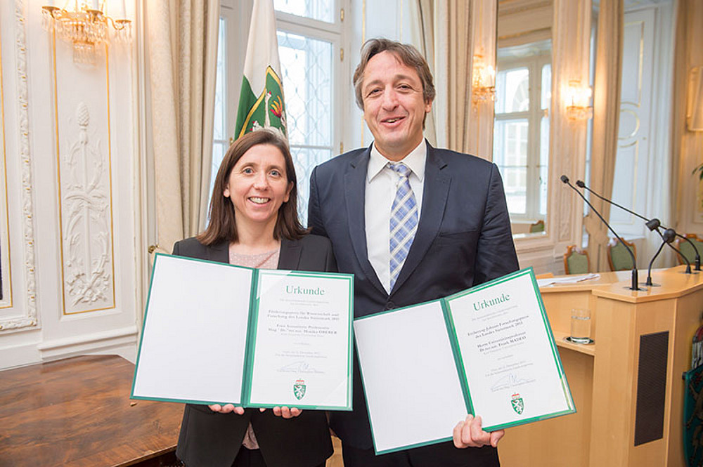 Monika Oberer und Frank Madeo wurden mit Forschungspreisen des Landes ausgezeichnet. Fotos: Fischer.
