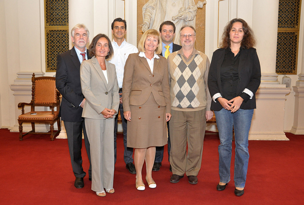Rektorin Neuper (Mitte) und BIB-Leiterin Sabine Pendl (zweite von links) mit den AnsprechpartnerInnen für Internationales der Fakultäten. Von links nach rechts beginnend mit der zweiten Reihe: Franz Brunner (URBI Fakultät),  Christian Hirt (SOWI Fakultät), Manuel Neubauer (REWI Fakultät), Norbert Tanzer (NAWI Fakultät) und Verena Kasper-Marienberg (GEWI Fakultät). Nicht im Bild: Kurt Remele (THEOL Fakultät).