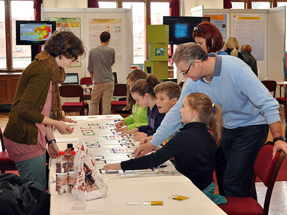 Rund 600 begeisterte BesucherInnen - darunter etwa 200 Kinder - wollten am Samstag einen Einblick in den Forschungsschwerpunkt "Modelle und Simulation gewinnen. Im Rahmen der Veranstaltung "Achtung Forschung!" bekamen sie an 15 Stationen die neuesten Erkenntnisse präsentiert und konnten zum Teil auch selbst mitmachen. Welches Flugzeug-Modell am weitesten fliegt, testeten die Kinder mit größter Begeisterung am Stand von "Einstein junior". Ebenso faszinierte die jüngern Gäste, wie man Farben entstehen und wieder verschwinden lassen kann, woraus sich Licht zusammensetzt oder wie Verunreinigungen ins Grundwasser (und wie schwer wieder heraus) gelangen. Die einzelnen Workshops und Sonderführungen im UniGraz@Museum erwiesen sich ebenfalls als Besuchermagneten. Auch Rektorin Christa Neuper und Landesrätin Kristina Edlinger-Ploder überzeugten sich persönlich, wie anschaulich und begreifbar Wissenschaft präsentiert werden kann.