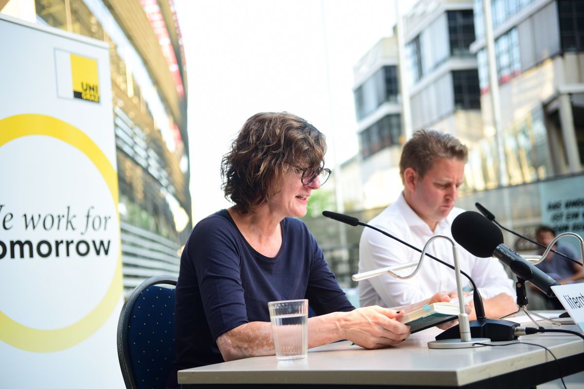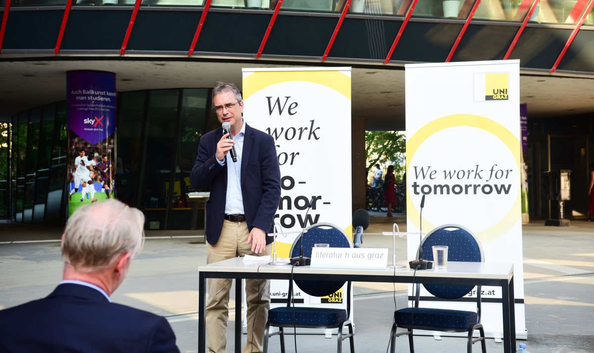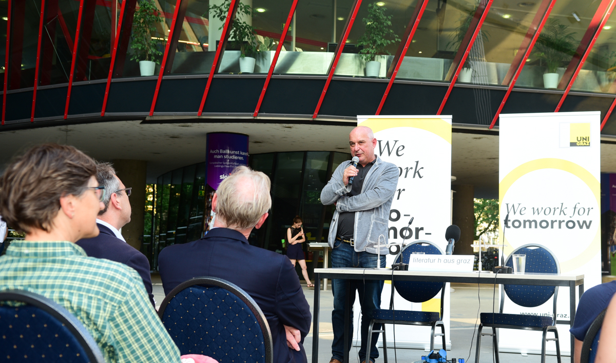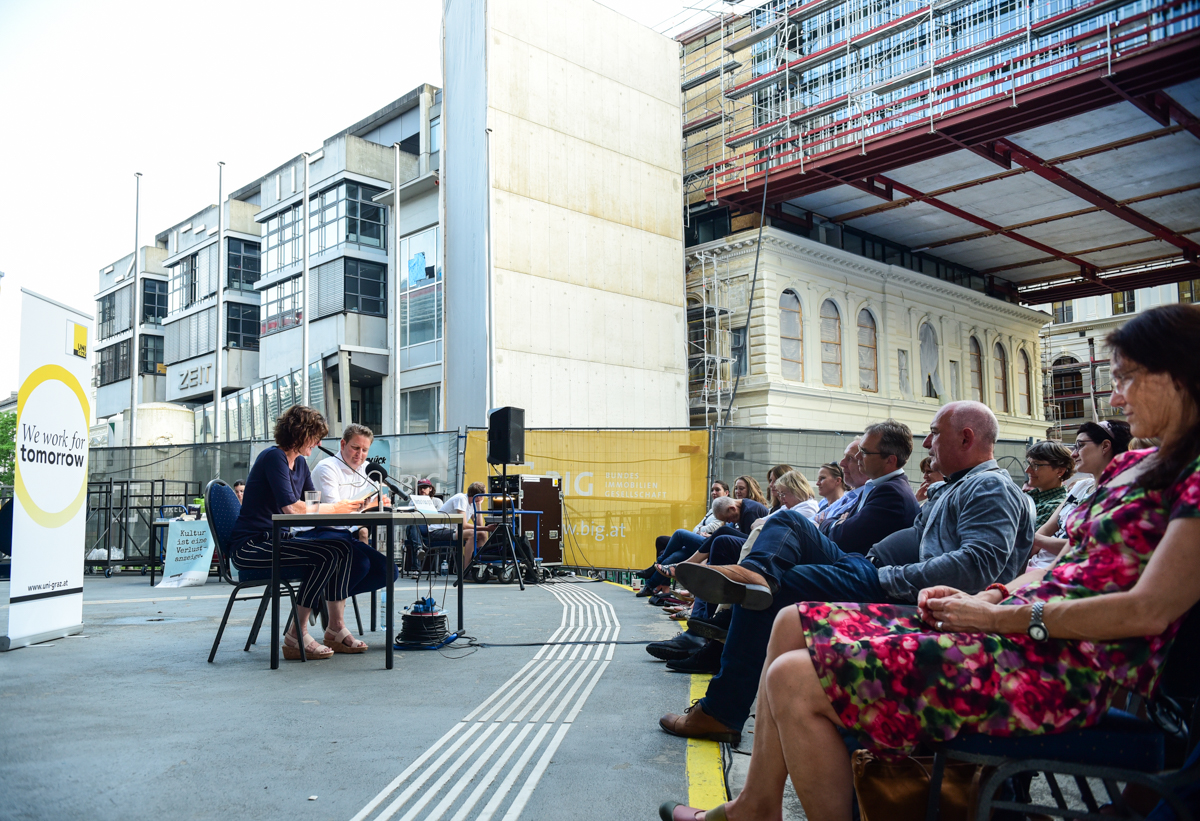 Es war ein lauer Sommerabend am gestrigen Montag. Perfektes Wetter für ein Experiment sozusagen. Die Universität Graz und das Grazer Literaturhaus luden zu einer literarischen Besonderheit, einer "Baustellenlesung" mit der österreichischen Autorin Doris Knecht auf den Vorplatz des RESOWI-Gebäudes. Der Platz wurde zur Bühne, die Stufen zum Publikumsraum. Vor der Kulisse der Universitätsbibliothek duellierten sich Doris Knecht und ihr Moderator, der Literaturkritiker Carsten Otte, wahrlich in einem Dialogefecht. Besprochen wurde der Roman "weg", den die Autorin mitgebracht hatte und der penibel genau vom Literaturkritiker unter die Augen genommen und im Zwiegespräch mit der Verfasserin zerpflückt wurde. Vizerektor Peter Riedler erzählte Wissenswertes über den Bibliotheksbau, Klaus Kastberger begrüßte als Leiter des Literaturhauses die Gäste und die ZuhörerInnen. Die Lesung, die aus dem Sommerprogramm des Grazer Literaturhauses entnommen wurde, sollte den Bezug Baustelle-Bibliothek-Buch herstellen und die Zeit bis zur Eröffnung des neuen Hauses Ende September verkürzen.