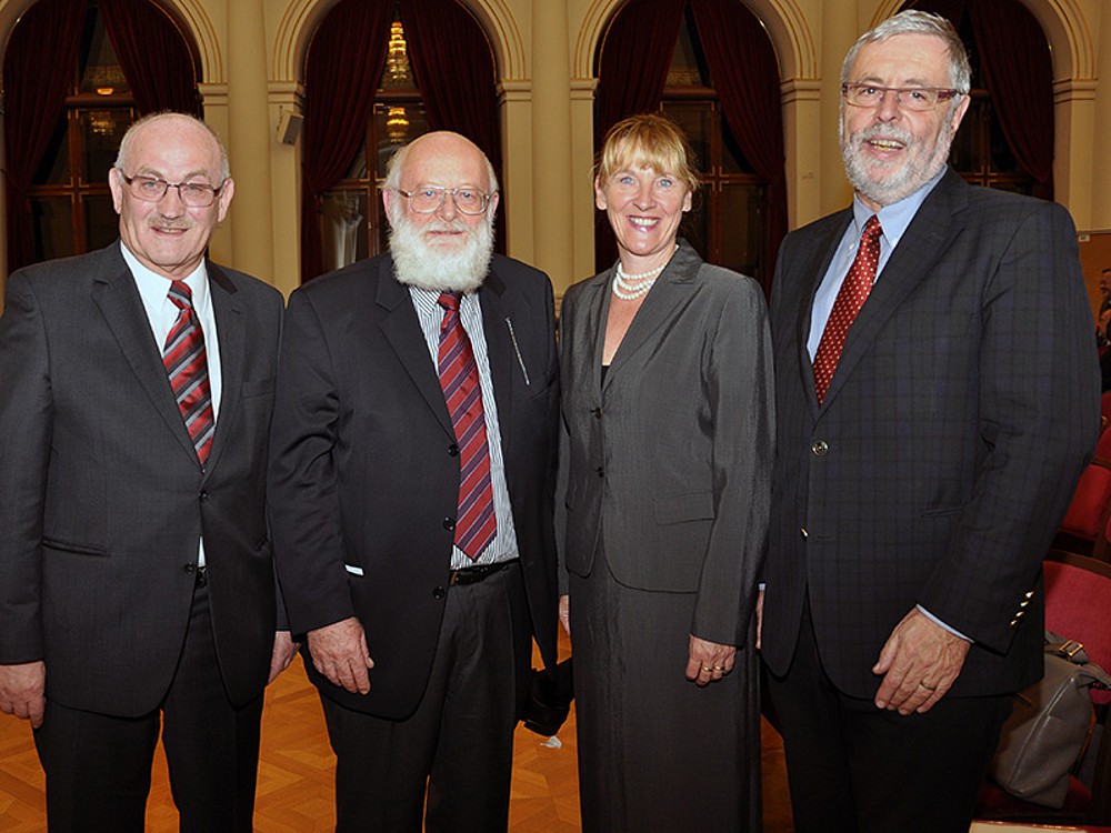 Feier in der Aula: Festredner Schwinges, Jubilar Höflechner, Sektionschefin Weitgruber und Laudator Konrad
