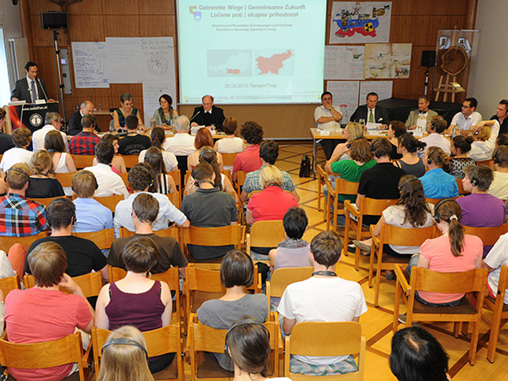 Das Nachbarland und seine Sprache besser kennenlernen, die eigene Familiengeschichte erforschen und herausfinden, wie Prägungen und Meinungen entstehen. Das waren die Hauptziele des Forschungsprojekts "Getrennte Wege - gemeinsame Zukunft", das Jürgen Pirker vom Institut für Österreichisches, Europäisches und Vergleichendes Öffentliches Recht, Politikwissenschaft und Verwaltungslehre der Uni Graz gemeinsam mit SchülerInnen aus Kärnten und Slowenien durchführte. Als Höhepunkt trafen sich kürzlich achtzig Jugendliche beider Länder zu einem intensiven dreitägigen Austausch in Tainach bei Völkermarkt. Zum Abschluss stellten sich PolitikerInnen - unter ihnen Europa-Abgeordnete Ulrike Lunacek -, DiplomatInnen und der Kärntner Diözesanbischof Alois Schwarz einer Diskussion mit den SchülerInnen.
