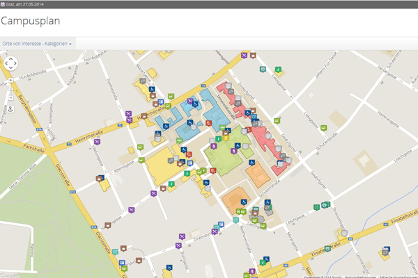 Infos zu 1300 Räumen. Herzstück des neuen Plans, der auf Google Maps Version 3 aufgebaut ist, ist die umfangreiche Suche. „Wir haben detaillierte Informationen wie etwa Größe, Ausstattung und UGO Nummer zu rund 1300 Räumen, Gebäuden und Orten von Interesse zusammengetragen und in das System implementiert“, erklärt Dieter Schäfer, Entwickler des Campusplans. „Sie sind auch in die Google Suche der Uni Graz integriert.“ Zudem wurden die Gebäudefarben im Plan mit dem bekannten Leitsystem am Campus kombiniert.