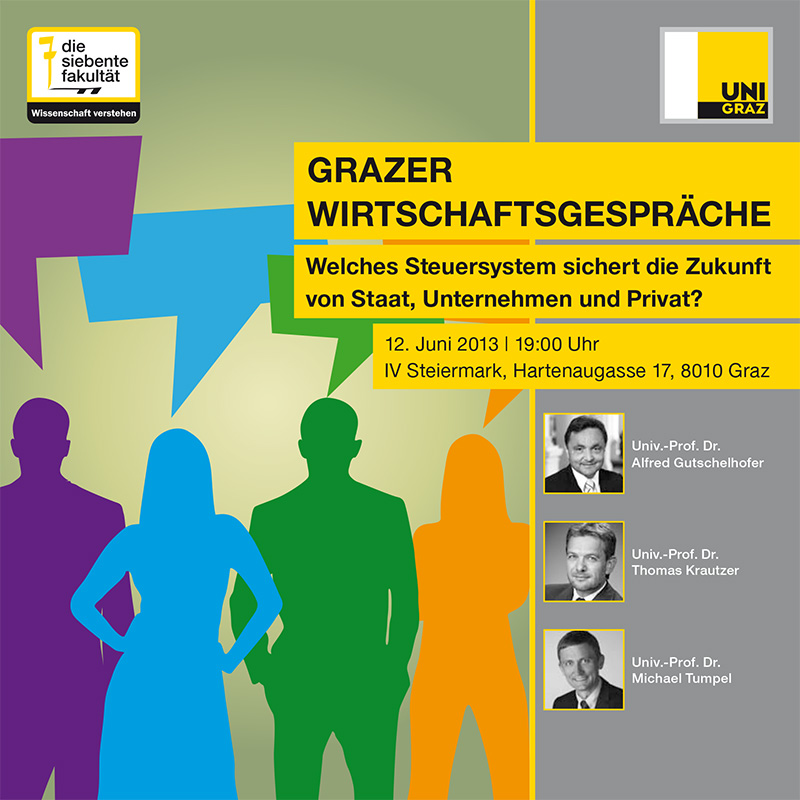 Die Veranstaltungsreihe „Grazer Wirtschaftsgespräche“ ist eine Kooperation des Zentrums für Entrepreneurship und angewandte Betriebswirtschaftslehre sowie der 7. fakultät, in deren Rahmen brisante Fragen und Herausforderungen aus den Bereichen Wirtschaft, Politik und Wissenschaft aufgegriffen und in gemütlicher Atmosphäre kontroversiell diskutiert werden.
