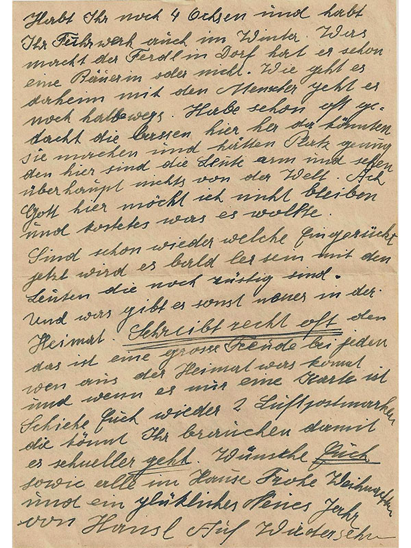 Johann Posch interessierte sich vor allem dafür, wie es zu Hause ging. Vorherrschendes Thema seiner Briefe ist die Landwirtschaft. „Dabei spiegeln sich Lebenswelt, Kultur und Selbstverständnis der bäuerlichen Bevölkerung der Region wider“, erklärt Ronald Posch. „Traditionelle Wertvorstellungen, Frömmigkeit, der Umgang mit Familie und die Strukturen der ländlichen Arbeitswelt werden deutlich.“ Johann Posch war Hoferbe. Während er als Soldat kämpfte, kümmerten sich seine Mutter und seine drei Halbschwestern mit einem Knecht um die Landwirtschaft. Der Vater war bereits alt und gebrechlich. Die Frauen mussten selbst Entscheidungen treffen. „Dennoch blieb die Autorität des Hausherrn außer Zweifel. Sie fragten ihn um Rat in alltäglichen Angelegenheiten, wie zum Beispiel, ob sie einen Ochsen schlachten sollten“, berichtet Ronald Posch.