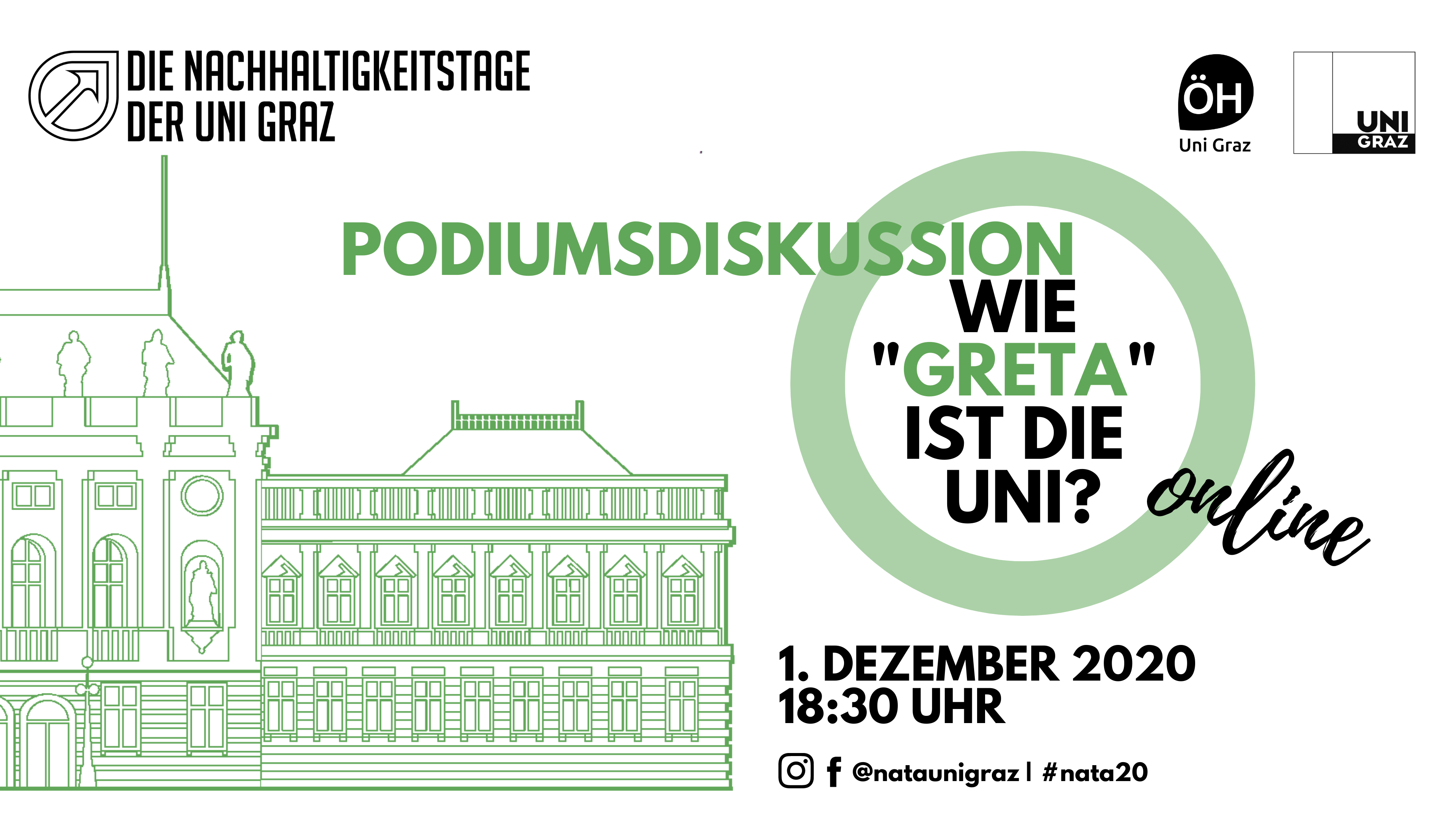 Als besonderes Highlight der diesjährigen Nachhaltigkeitstage, die als Online-Version von 1. bis 3. Dezember veranstaltet werden, lädt die Uni Graz heute Dienstag, um 18:30 zu einer Podiumsdiskussion unter dem Titel “Wie “Greta” ist die Uni?” mit VertreterInnen der Universität, der Wissenschaft sowie AktivistInnen ein. Im Fokus steht die Klimaschutzpolitik an der Uni Graz. Unter anderem werden folgende Fragen diskutiert: Wie ist der Status quo im Bereich Nachhaltigkeit und Klimaschutz an der Uni Graz? Was kann/ soll hier noch getan werden? Wie sieht eine nachhaltige Universität der Zukunft aus? Was muss sich auf politischer, gesellschaftlicher und wirtschaftlicher Ebene tun, um den Weg hin zu einer CO2 neutralen Uni zu beschleunigen?