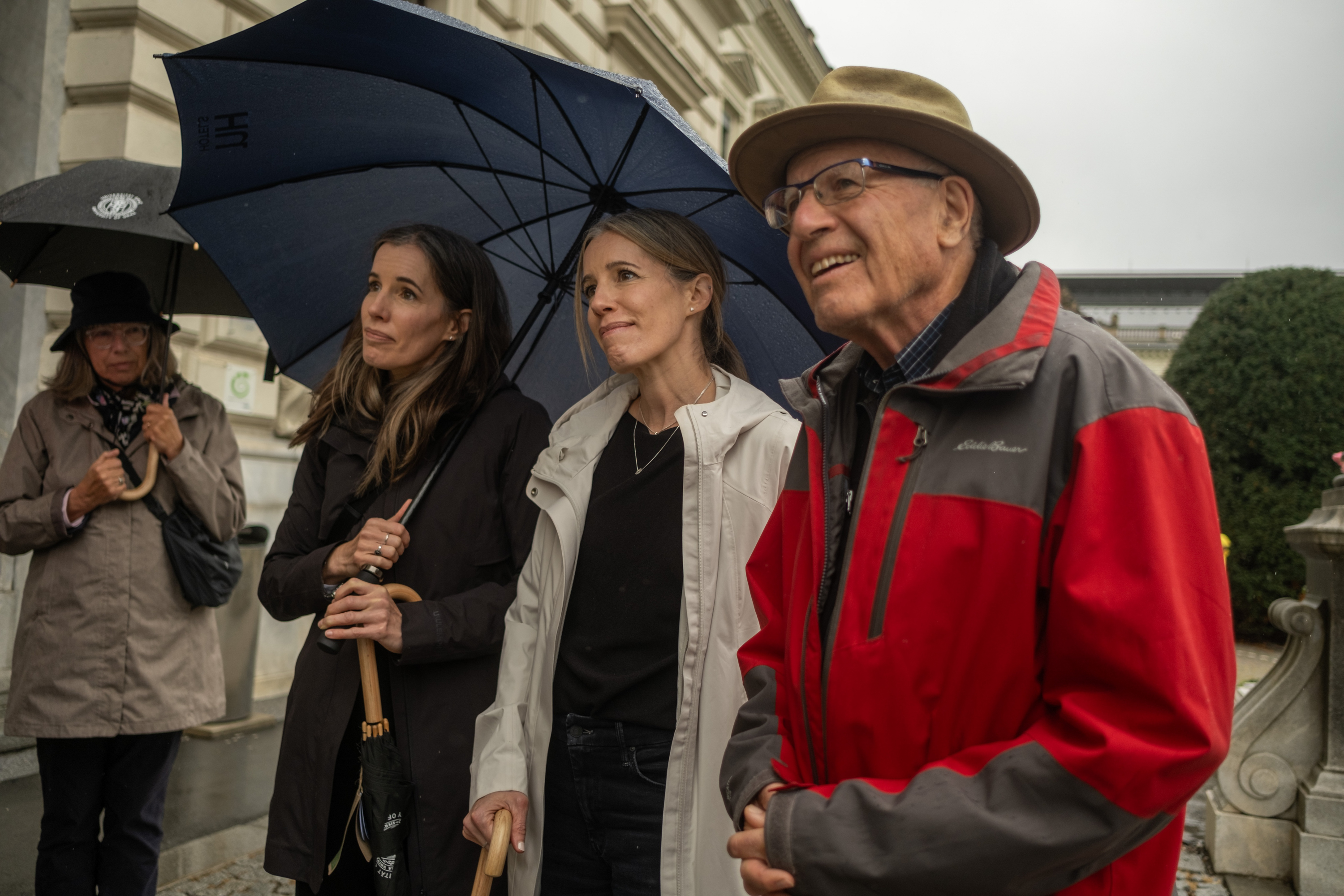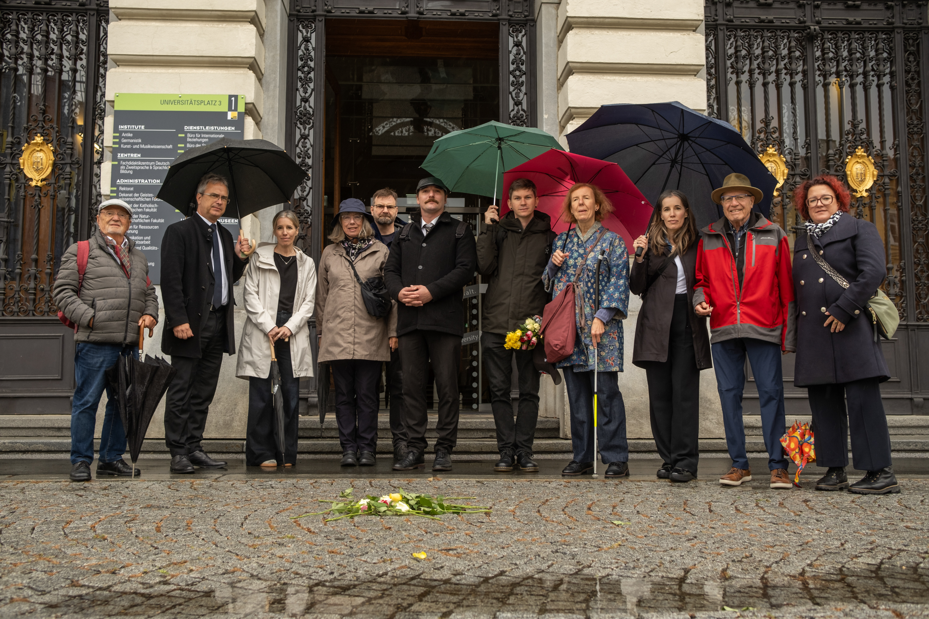 86 Jahre ist es her, dass jüdische Studierende und Lehrende von der Universität Graz vertrieben worden sind. Eine war Gisela Kaufmann. Die Studentin konnte trotz ihrer Blindheit und der antisemitischen Verfolgung durch das NS-Regime 1938 ihre Promotion abschließen. Mitte September reiste nun ihre Familie aus Kanada an, um den Stolperstein zu besuchen und der Erinnerung an Gisela Kaufmann neuen Raum zu geben. Unter den Gästen befand sich Reuben Kaufman, der Sohn ihres älteren Bruders und emeritierter Biologie-Professor der University of Alberta, zusammen mit seiner Partnerin und seinen Töchtern Naomi und Rachel. Gemeinsam legte die Familie Blumen und Steine am Stolperstein vor dem Hauptgebäude nieder, danach lud Rektor Peter Riedler die Angehörigen in den Senatssaal der Universität ein.