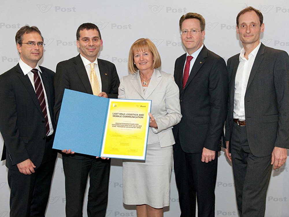 Der Online-Versandhandel boomt, die Lieferung der Pakete wird aber eine immer größere Herausforderung. Die KundInnen sind selten zu Hause, wenn die Bestellung ankommt, eine Zustellung an den Arbeitsplatz ist meistens unerwünscht. Muss man die Waren eigens bei der Post abholen, bedeutet das erstens einen zusätzlichen Weg, zweitens lässt sich das aufgrund der eingeschränkten Öffnungszeiten schwer einteilen. Wie man diese Last-Mile-Logistik für die Post möglichst kostengünstig und für die EmpfängerInnen möglichst komfortabel gestaltet, erforscht nun das Zentrum für Digitale Kommunikation der Karl-Franzens-Universität in Zusammenarbeit mit dem ersten Innovationszentrum der Österreichischen Post AG. Rektorin Christa Neuper, Vizerektor Peter Riedler, Zentrumsleiter Otto Petrovic sowie die Post-Vorstandsdirektoren Peter Umundum und Walter Hitziger unterzeichneten kürzlich den entsprechenden Kooperationsvertrag.