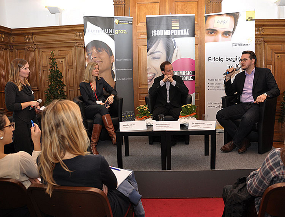 Konstantin Tzivanopoulos von der Pressestelle der Uni Graz sprach in der Podiumsdiskussion unter der Moderation von Tanja Baumgartner, alumni UNI graz, über Beruf(e) und Berfung(en).