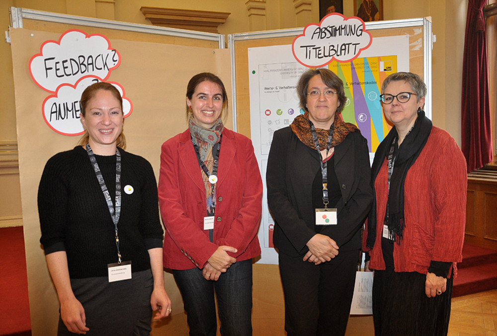 In seine Entstehung waren in den vergangenen zwei Jahren fast 400 MitarbeiterInnen der Uni Graz eingebunden. Am 28. Oktober 2014 gab es zum letzten Mal die Möglichkeit, Feedback, Ideen und Änderungswünsche zum Leitfaden einzubringen. Das Projekteam - Mag. Kerstin Käfer, Mag. Ulrike Großschädl von der Personalentwicklung und Dr. Barbara Reiter vom Institut für Philosophie - wird den Input in den aktuellen Entwurf einfließen lassen, sodass das fertige Produkt sobald wie möglich präsentiert werden kann.