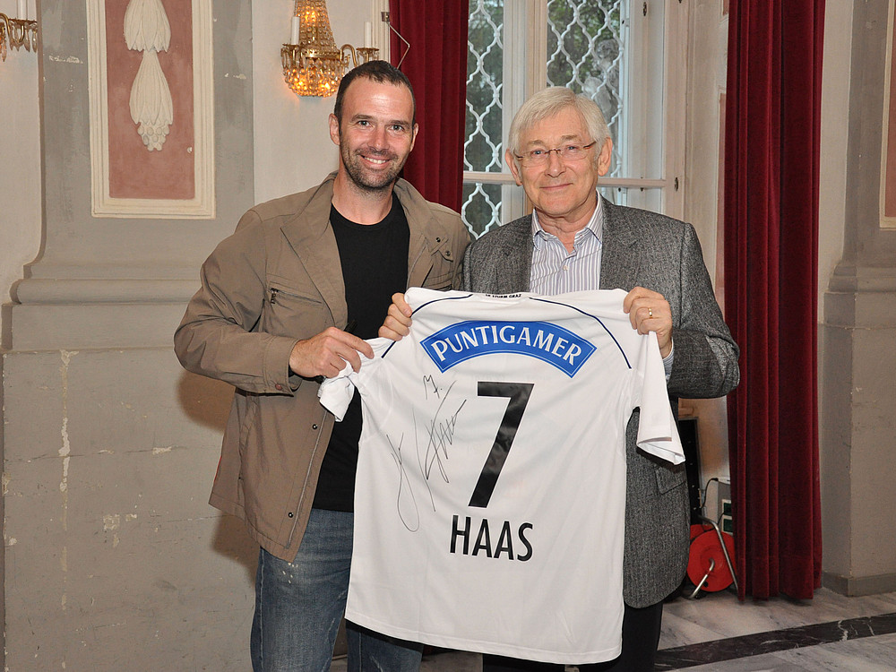 Mit seinem Wortwitz und seiner Eloquenz füllt er die Hörsäle am Institut für Anglistik, wenn er wollte wohl auch Fußballstadien. Was lag also näher als beides miteinander zu verbinden. Ao.Univ.-Prof. Dr. David Newby – ein ausgewiesener Sturm-Anhänger – wurde im Rahmen seines Vortrags der Anglo-Austrian Society for Styria am 24. April 2013 im Meerscheinschlössl mit einem Besuch von Fußball-Profi und Sturm-Kicker Mario Haas überrascht.