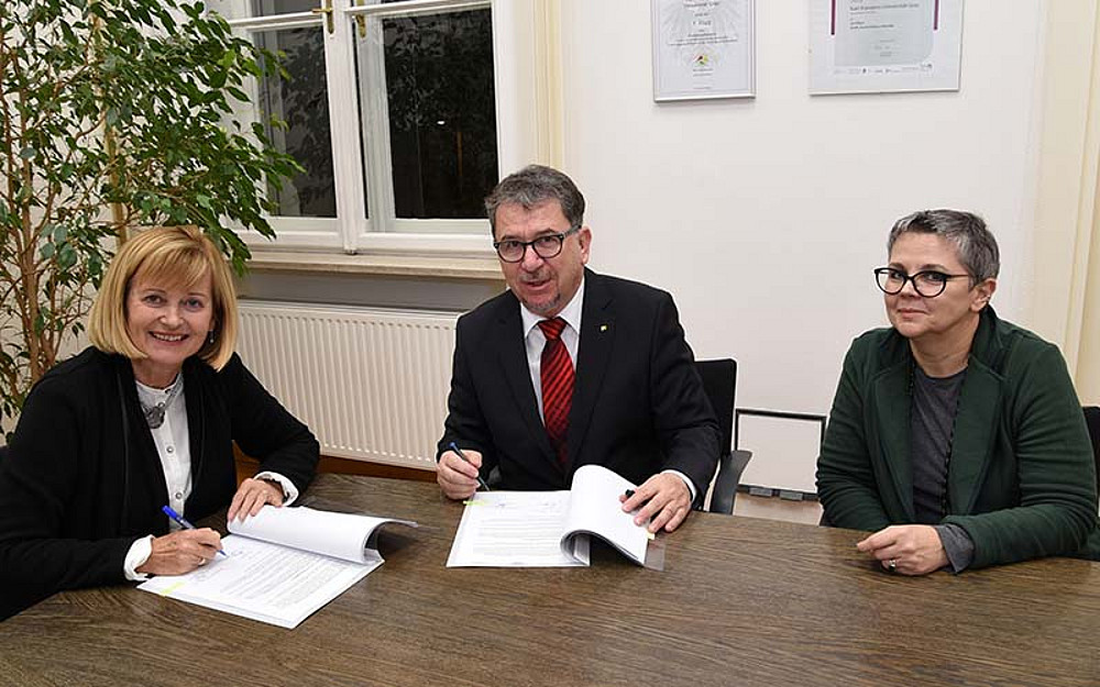 Rektorin Christa Neuper und der Vorsitzende des Betriebsrats für das wissenschaftliche Universitätspersonal, Ao.Univ.-Prof. Dr. Ingo Kropac, unterzeichneten am 16. Dezember 2015 im Beisein von Vizerektorin Renate Dworczak eine neue Betriebsvereinbarung über die wissenschaftliche Karriere an der Universität Graz. Darin werden Anpassungen vorgenommen, die sich aus der gelebten Praxis ergeben und durch die anstehende Novelle des Universitäten-Gesetzes notwendig werden.