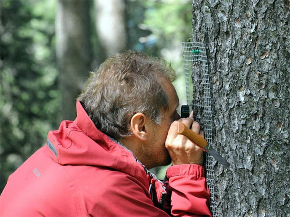 Projektleiter Juri Nascimbene untersucht Flechten auf einem Baum. Helmut Mayerhofer vom Institut für Pflanzenwissenschaften der Uni Graz arbeitet ebenfalls an dem Forschungsvorhaben mit. Foto: Pressedienst der Provinz Bozen.