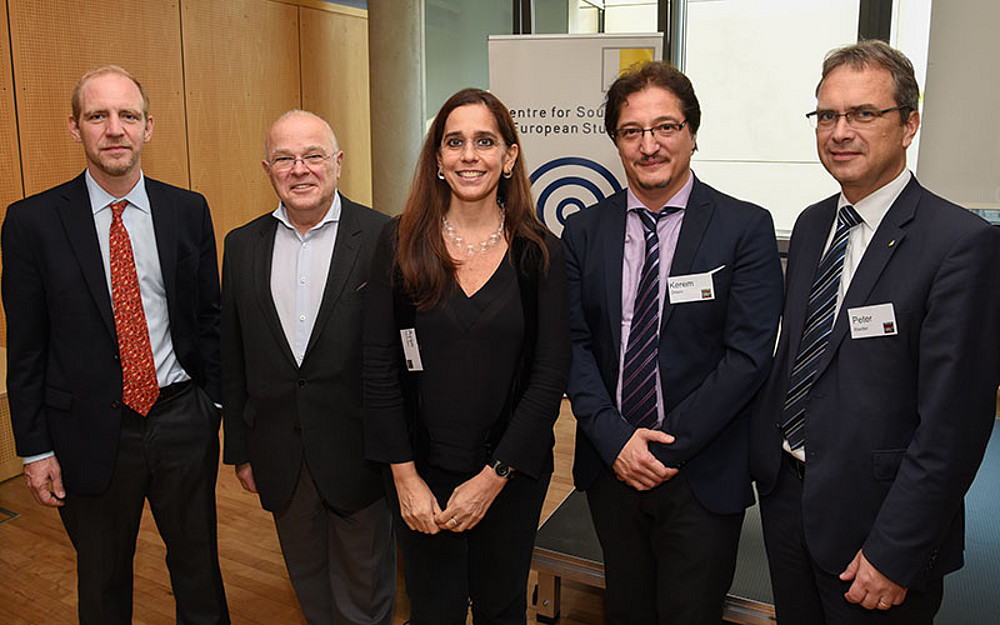 V.l.: Florian Bieber, Joseph Marko, Keynote Speaker Ayşe Kadıoğlu, Dekanin der Universität Sabancı in Istanbul, Kerem Öktem, Professor für Südosteuropa und die moderne Türkei an der Uni Graz, Peter Riedler. Fotos: Uni Graz/Tzivanopoulos