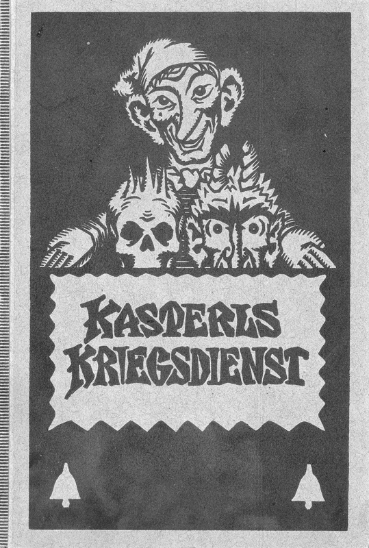 Auch Kasperl kämpft an der Front: Fritz Silberbauer: Titelbild von: Fritz Oberndorfer: Kasperls Kriegsdienst. Ein Spielheft. Hg. v. Robert Michel. Graz u. Leipzig 1917. [Im Original in Rot.]