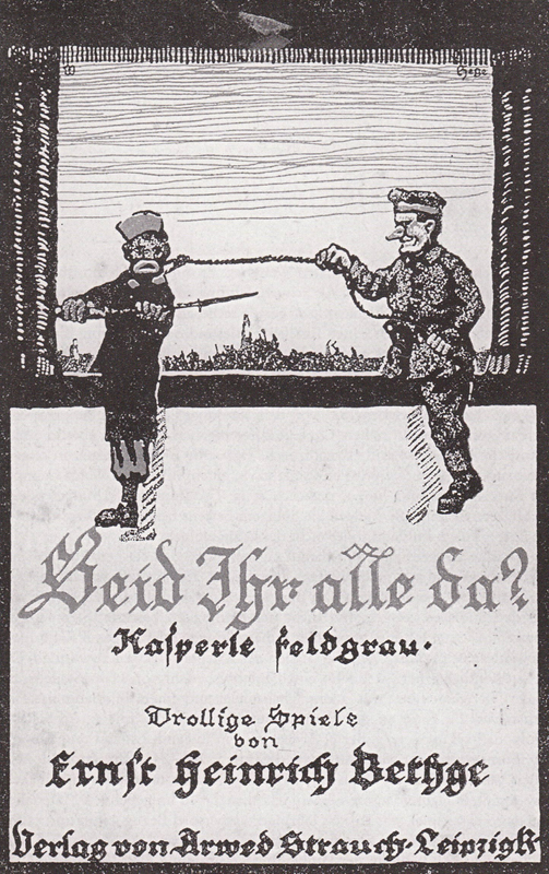 Der feldgraue Kasperl. W[alter] Hege: Titelbild von Ernst Heinrich Bethges Seid ihr alle da? (1918). Aus: Olaf Bernstengel: Militaria im Puppenspiel zwischen 1805 und 1933. In: Front¬PuppenTheater. Puppenspieler im Kriegsgeschehen. Hg. v. Dorothea Kolland und Puppentheater-Museum Berlin. Berlin 1997, S. 61.