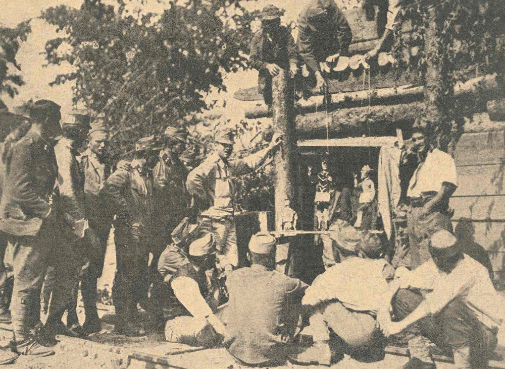 Kasperl hilft über den Kriegsalltag hinweg: Vorstellung eines Marionettentheaters an der österreichischen Front an der Brenta (1916). Fotografie. In:Welt und Haus 14 (1916), H. 48, S. 4.