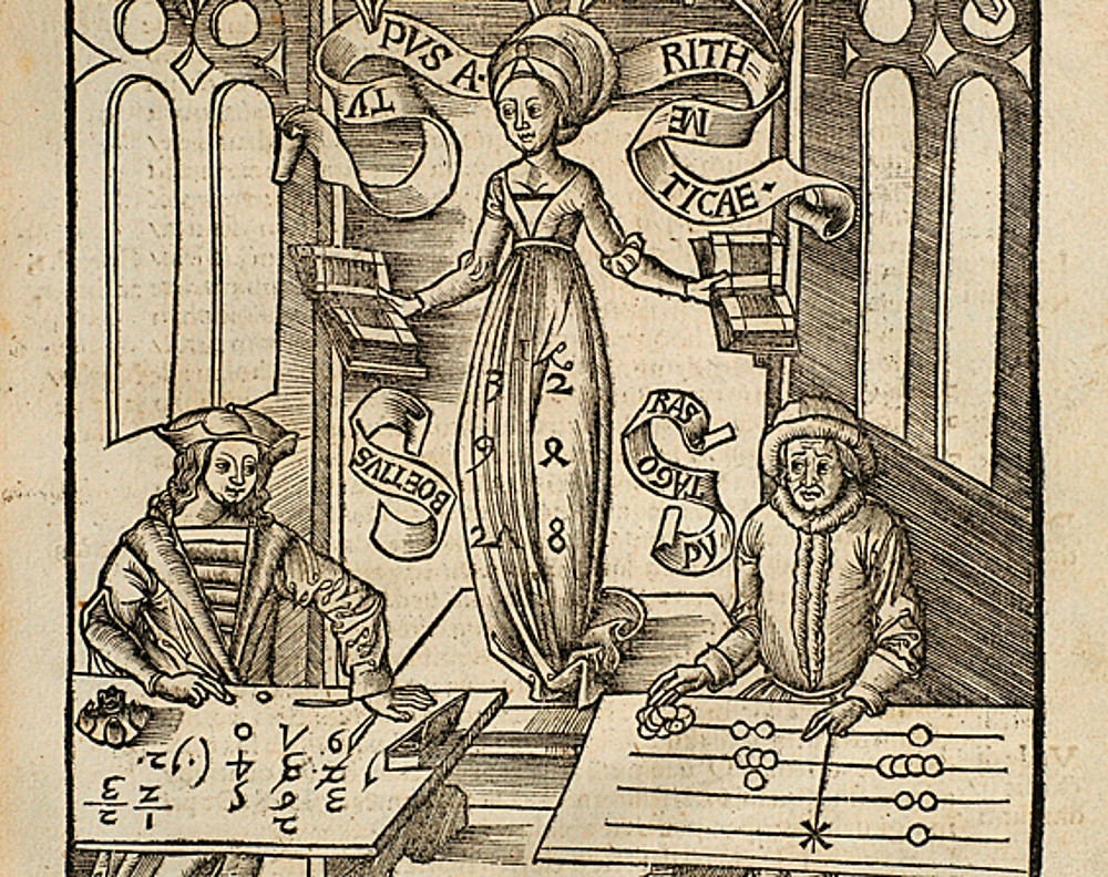 "Im späten Mittelalter vollzog sich der Wechsel vom Rechnen mit den römischen Zahlzeichen zum Rechnen mit den sogenannten indisch-arabischen Ziffern", erklärt Bruno Besser (IWF/ÖAW), wissenschaftlicher Mitarbeiter der Ausstellung. In der aus dem Bestand der Universitätsbibliothek stammenden Enzyklopädie des Gregor Reisch (ca. 1470–1525) ist die epochale Ablöse anschaulich dargestellt: Pythagoras wird auf der rechten Seite als alter Meister charakterisiert, der noch das herkömmliche Rechensystem praktiziert. Er sitzt an einem Rechentisch mit Linien und gelangt durch das Verschieben von Rechensteinen zum Ergebnis. Links vertritt der junge, modisch gekleidete Boethius die moderne Rechenkunst mit arabischen Ziffern: Er benötigt keine Hilfsmittel mehr, wie den römischen Abakus oder das Rechenbrett, sondern nur die Schreibfeder.