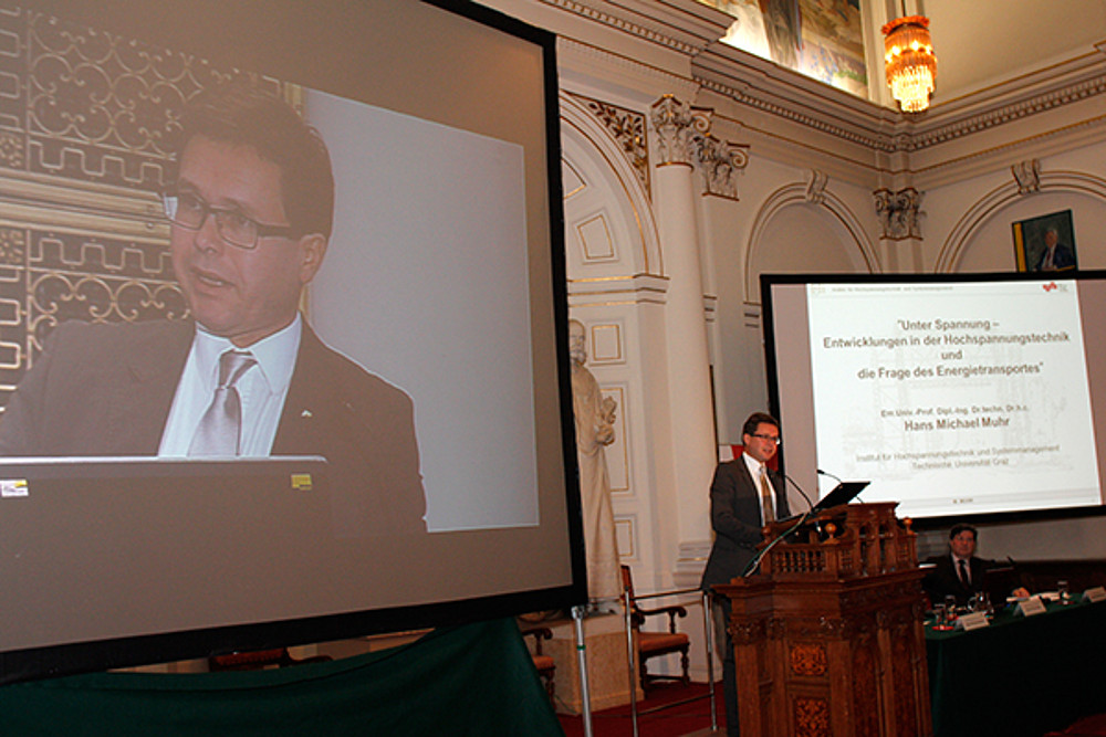 Ein Montag im Oktober in der Aula der Uni Graz: Zeit für die Montagsakademie. Das traditionelle  Weiterbildungsformat für die breite Öffentlichkeit startete am 22. Oktober 2012 mit dem Leitthema "Spannungen" in die neue Periode. Den Beginn der Saison machte gleich ein hochspannendes Thema: O.Univ.-Prof. Dipl.-Ing. Dr.techn. Dr.h.c. Hans Michael Muhr, langjähriger Leiter des Instituts für Hochspannungstechnik & Systemmanagement an der TU Graz, referierte über jüngste Entwicklungen der Hochspannungstechnik und die Frage des Energietransportes.