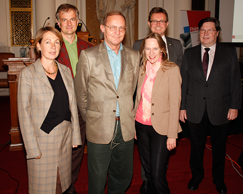 Gemeinsamer Start ins Semester: Johanna Rolshoven, Alfred Posch, Vortragender Hans Michael Muhr, Katharina Scherke, Vizerektor Polaschek und Leopold Mathelitsch (v.l.)