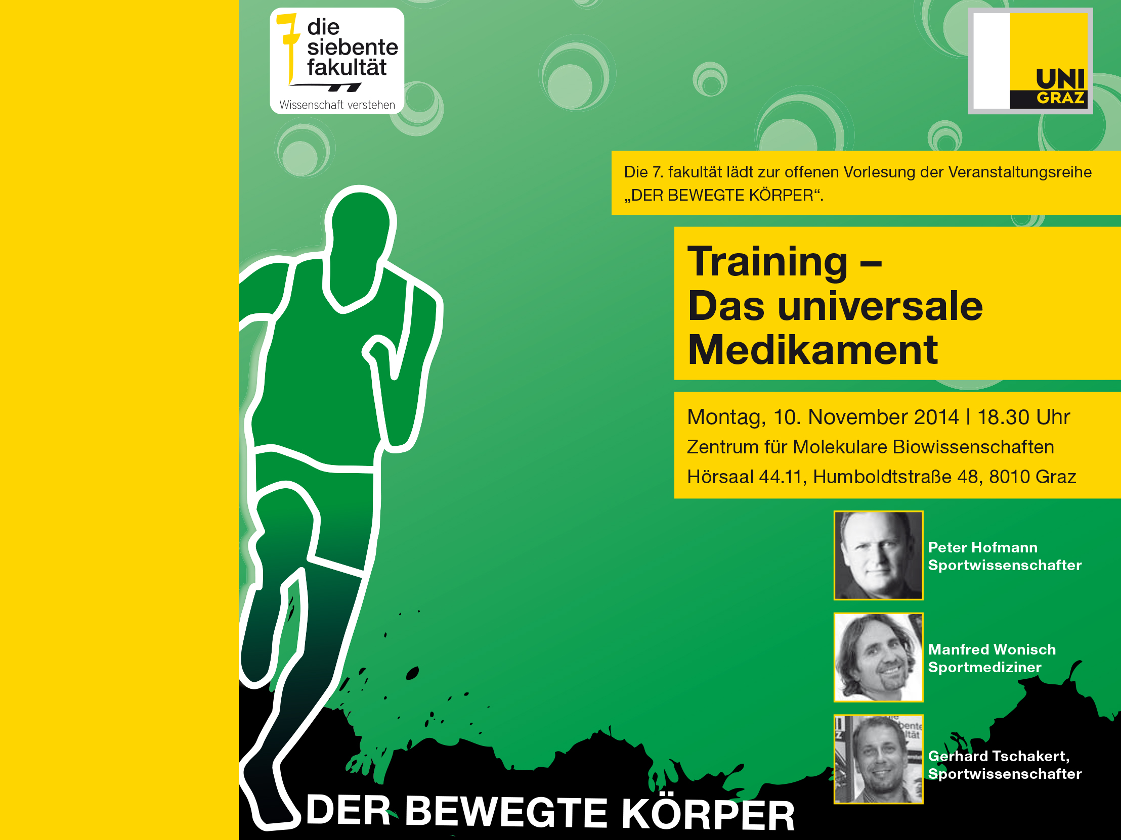 Als Gastgeber und Moderator fungiert Sportwissenschafter Gerhard Tschakert, der regelmäßig im Rahmen der Uni-Graz-Reihe „Der bewegte Körper“ wissenschaftliche Aspekte aus den Bereichen Leistungsfähigkeit, Gesundheit durch Sport und Körperkult in Form einer offenen Vorlesung interessierten ZuhörerInnen näher bringt.