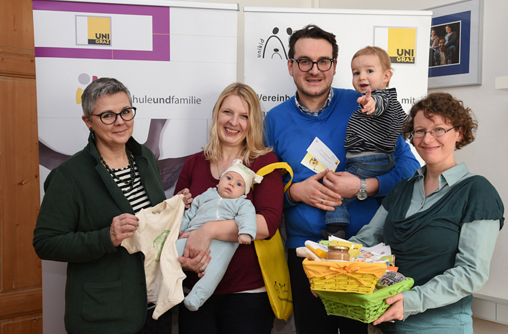 Familienzuwachs wird an der Universität Graz nun auf eine ganz besondere Weise begrüßt: Alle Neugeborenen von Uni-Bediensteten bekommen ein von unikid & unicare zusammengestelltes Willkommenspaket überreicht. Das Package beinhaltet neben einem Babybody und -Mütze aus dem Unistore eine kleine Auswahl an Pflegeprodukten, Infomaterial rund um die Familienorganisation sowie Gutscheine, die von Vizerektorin Renate Dworczak und der Raiffeisen gesponsert werden. Dworczak setzt mit diesem Paket für Familien eine weitere Initiative, um die Vereinbarkeit von Beruf und Familie zu fördern. Das erste Exemplar überreichten die Vizerektorin sowie die Leiterin von unikid & unicare, Julia Spiegl, an Familie Tzivanopoulos und deren Sohn Achilleas. Übrigens: Für neugeborene Kinder von Studierenden gibt es ein eigenes Paket. Geschnürt werden soll es gemeinsam mit der ÖH.