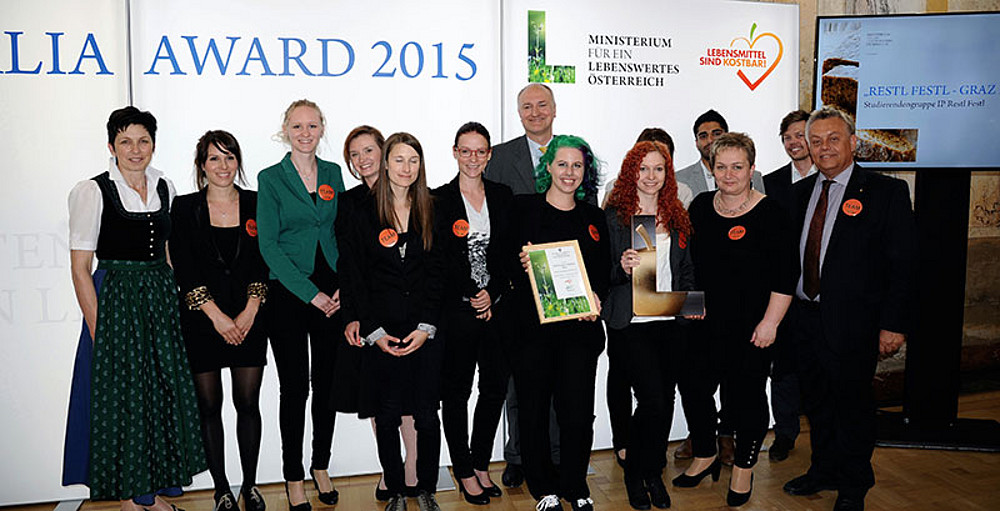 Aus den knapp 100 Einreichungen wurden Siegerprojekte in sechs Kategorien gekürt. In der Kategorie "Landwirtschaft und regionale Produkte" gewann die Studierendengruppe Interdisziplinäres Praktikum (IP) Restl Festl der Uni Graz mit ihrem Projekt "Restl Festl – Graz isst auf", die den Preis gemeinsam mit  IP-Leiterin Dr. Ulrike Gelbmann entgegen nahm. Die höchst erfolgreiche Aktion setzte im vergangenen Oktober ein erfolgreiches Zeichen gegen Lebensmittelverschwendung und wurde im März 2015 bereits mit dem Enery Globe Styria Award des Landes Steiermark ausgezeichnet.