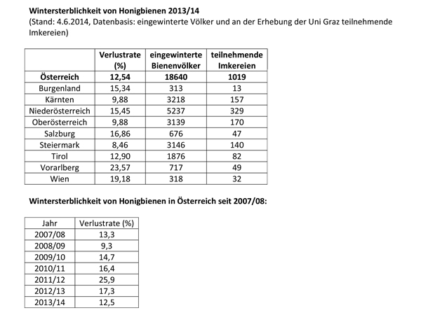 Der milde Winter 2013/2014 war auch mild zu den Honigbienen Österreichs. Die bundesweite Verlustrate lag mit rund 12,5 Prozent deutlich niedriger als in den Wintern davor – allerdings leicht über einer als normal angesehenen Sterblichkeit. Zu diesem Ergebnis kommen Univ.-Prof. Dr. Karl Crailsheim und Dr. Robert Brodschneider vom Institut für Zoologie der Uni Graz nach der Auswertung der aktuellen Daten. Die beiden sammeln seit sieben Jahren Angaben von Imkereien. „Wir haben bisher mehr als 5200 Datensätze erhalten, die wir für weitere epidemiologische Untersuchungen nutzen und als Datenbank auf www.Bienenstand.at auch der Öffentlichkeit zur Verfügung stellen“, erklärt Robert Brodschneider.