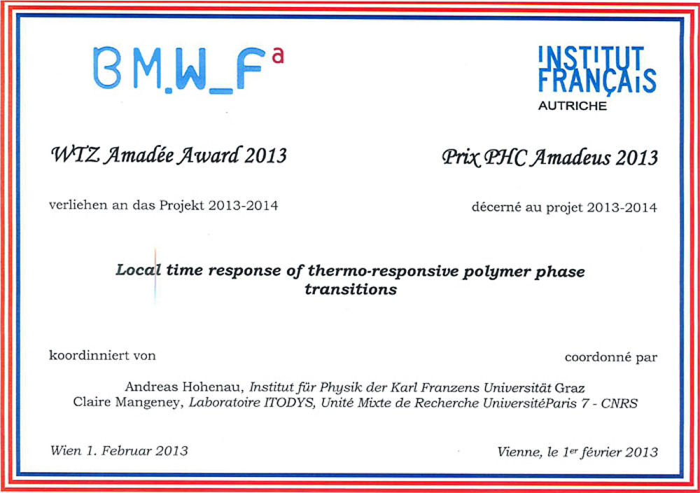 Ziel des Projekts ist es, durch Kombination aus Oberflächenchemie (Paris) und Nano-Optik (Graz) erstmals die Möglichkeit zu schaffen, das Kurzzeitverhalten von thermisch induzierten Phasenübergängen spezieller Polymere in sub-mikrometrischen Volumina zu untersuchen. In kleinen Volumina sollten die Phasenübergange wesentlich schneller ablaufen als es an makroskopischen Proben beobachtet wird. Die gewonnenen Erkenntnisse könnten sowohl für die Entwicklung neuer photonischer Elemente als auch für neuartige Biosensoren von Bedeutung sein.