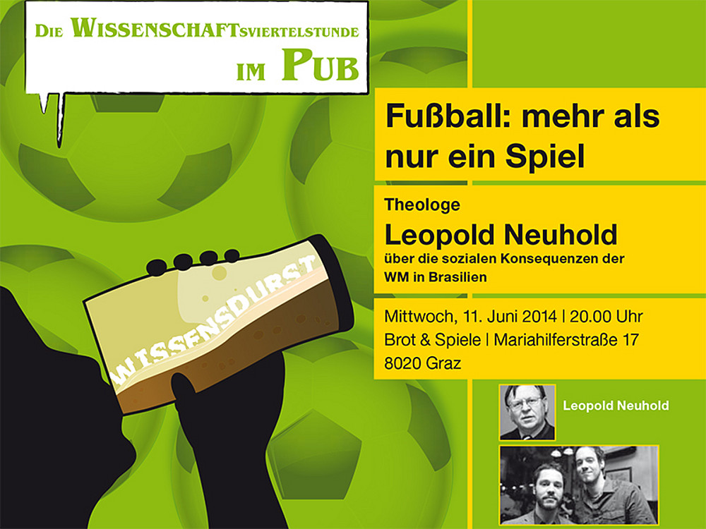 Ein spannendes Match ist bereits am Vorabend der Fußball-WM garantiert: Theologe Univ.-Prof. Dr. Leopold Neuhold, auch passionierter Fußballfan, beleuchtet in einer weiteren Ausgabe von „Wissensdurst – die Wissenschaftsviertelstunde im Pub“ den gesellschaftlichen Einfluss des sportlichen Großereignisses in Brasilien. Besonderes Augenmerk wird Neuhold auf die Ursache der jüngsten sozialen, teils gewaltsamen Proteste richten. Nach der 15-minütigen Kurz-Vorlesung im Lokal wird er mit den Gästen die Frage diskutieren, ob Fußball nicht doch mehr als nur ein Spiel ist?