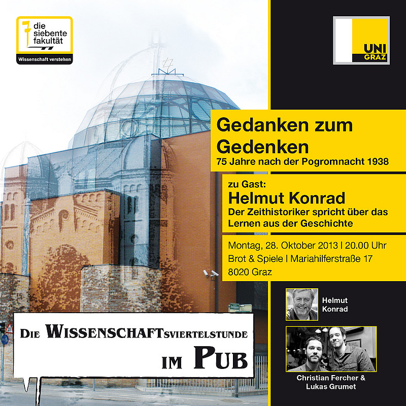 Zum 75. Mal jähren sich am 9. November die tragischen Ereignisse der Pogromnacht von 1938. Der anerkannte Zeithistoriker Univ.-Prof. Dr. Helmut Konrad nimmt die Wiederkehr der Verfolgung der jüdischen Bevölkerung zum Anlass, um das Lernen aus der Geschichte zu beleuchten. Die Veranstaltung findet im Rahmen der Uni-Graz-Reihe „Wissensdurst – die Wissenschaftsviertelstunde im Pub“ statt.