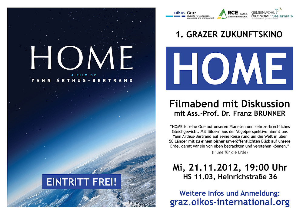 filmefuerdieerde.ch schreibt: “HOME ist eine Ode auf unseren Planeten und sein zerbrechliches Gleichgewicht. Mit Bildern aus der Vogelperspektive nimmt uns Yann Arthus-Bertrand auf seine Reise rund um die Welt in über 50 Länder mit zu einem bisher unveröffentlichten Blick auf unsere Erde, damit wir sie von oben betrachten und verstehen können.”