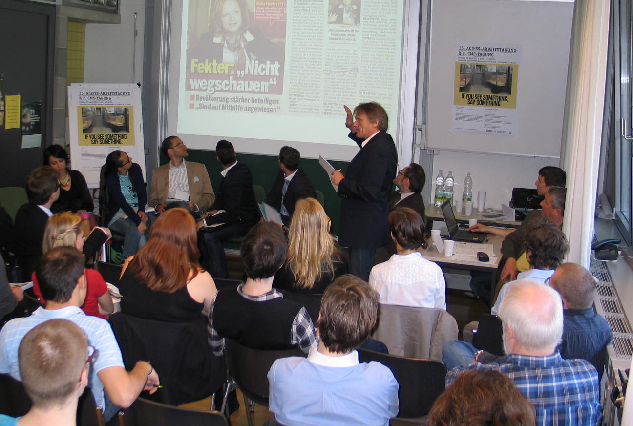 Einmal im Semester veranstaltet das an die Universität Graz angegliederte Kompetenzzentrum ACIPSS – unter der Leitung des Historikers Ao. Univ.-Prof. Dr. Siegfried Beer – einen ganztägigen Workshop, bei dem regelmäßig Gäste bzw. Vortragende aus ganz Österreich und dem Ausland über ihre Forschungen und Aktivitäten berichten. Die Arbeitstagungen sind sowohl ein öffentliches Präsentationsforum für wissenschaftliche Forschung in den „drei Säulen“ Intelligence, Propaganda und Security Studies, als auch ein Ort der Diskussion. Die Teilnahme ist frei.