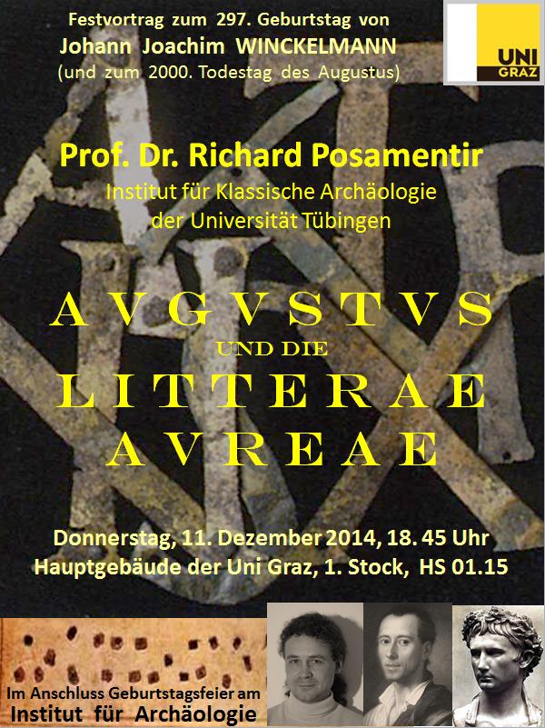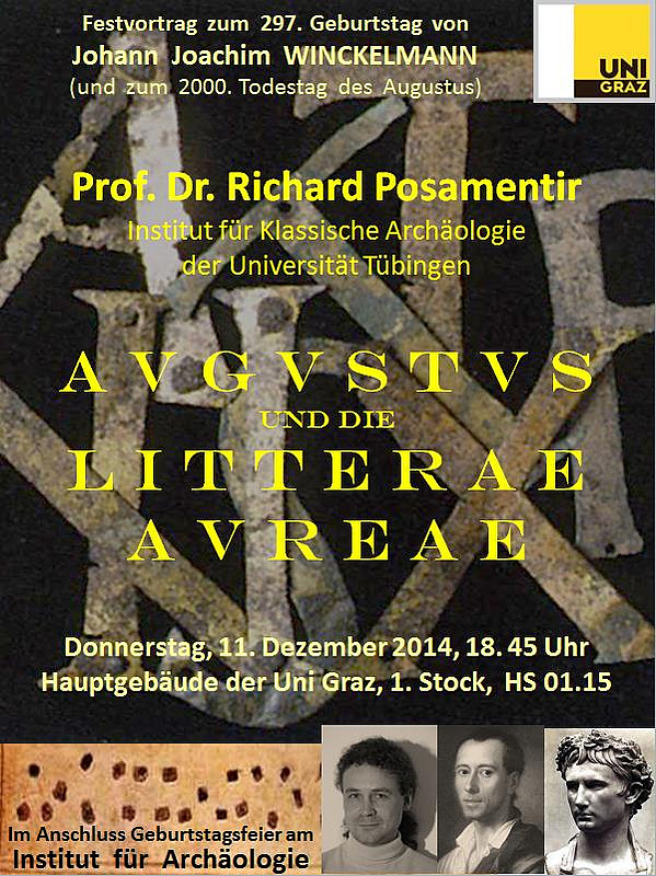 Anlässlich des Geburtstages von Johann Joachim Winckelmann (geb. 9.12.1717), des Begründers der Klassischen Archäologie, wird in traditioneller Weise an deutschen bzw. deutschsprachigen Archäologischen Instituten ein Festvortrag mit anschließendem geselligen Beisammensein organisiert. Heuer wird Prof. Mag. Dr. Richard Posamentir, Universität Tübingen, zum Thema "Augustus und die Litterae Aureae" sprechen.